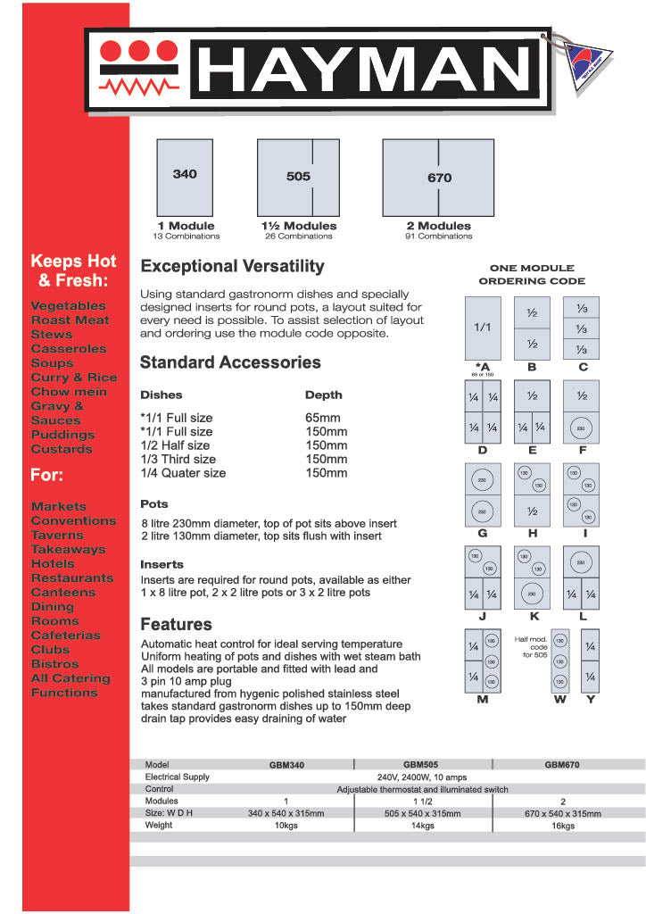 - The GBM 340 has a possible 13 different combinations of dishes.